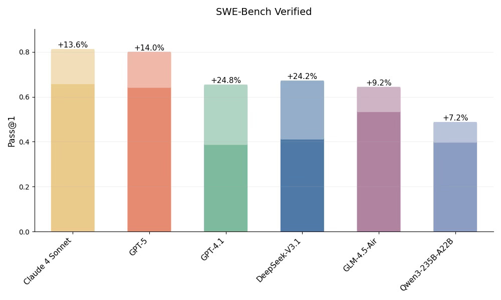 With Aline25, all coding agents show improved bug-solving performance through experience reuse; GPT-5 and Claude improve by over 13%, achieving the best results to date on coding benchmarks.